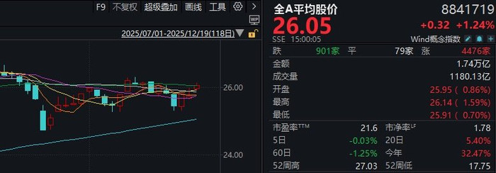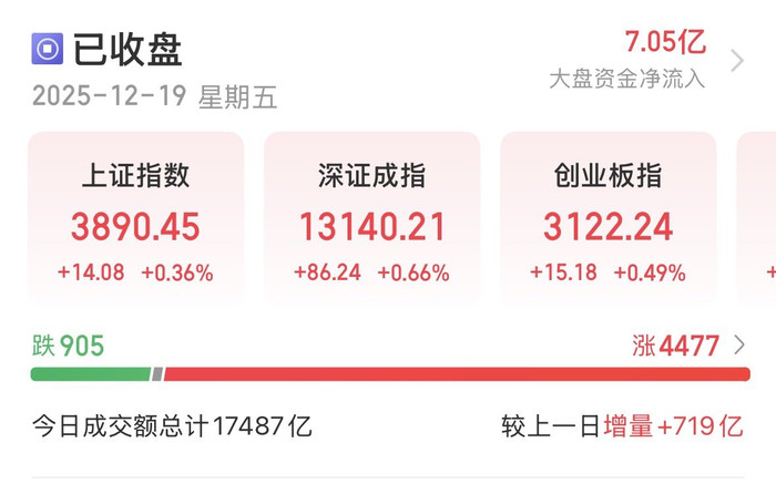 12月19日,本周最后一个交易日,A股三大指数集体上涨,沪指更是盘中一度收复3900点。截至收盘,沪指涨0.36%,收报3890.45点;深证成指涨0.66%,收报13140.21点;创业板指涨0.49%,收报3122.24点。全市场全天成交额17487亿,较昨日放量719亿。个股与指数形成正向联动,全市场超4400只个股飘红,市场赚钱效应凸显。